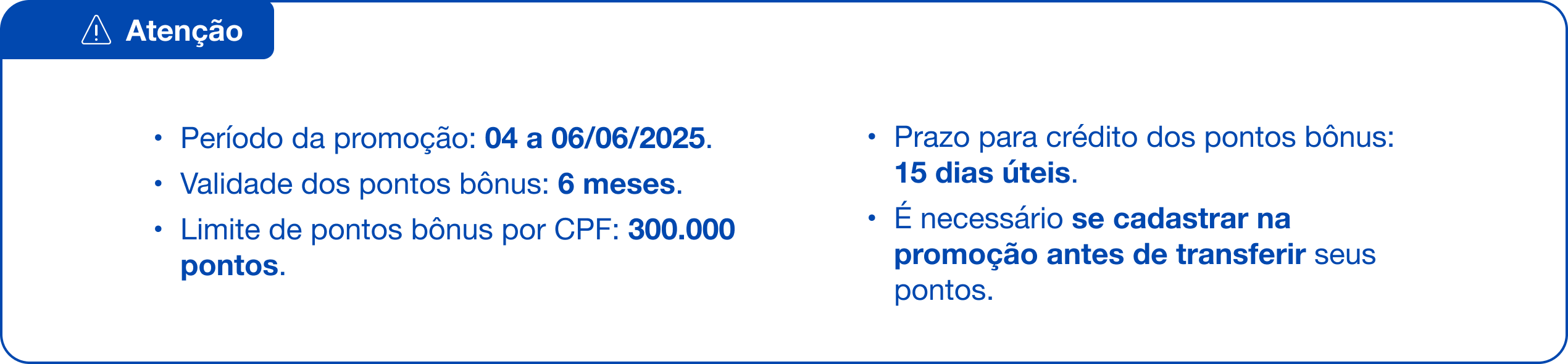 7. Os pontos bônus serão creditados em até 15 dias úteis após o término da campanha.