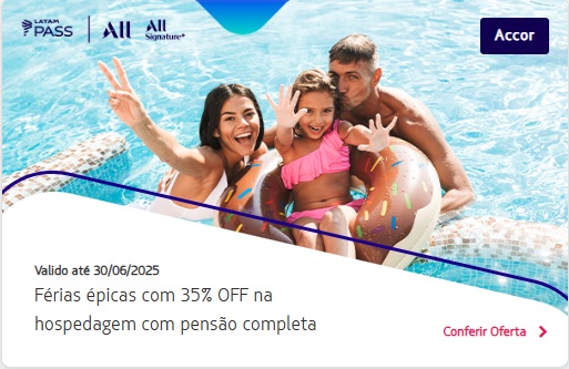 Clientes LATAM Pass que são associados ALL garantem 35% de desconto nas diárias, 2 ingressos para a tirolesa e hospedagem grátis para 2 crianças de até 12 anos, no mesmo quarto dos pais.