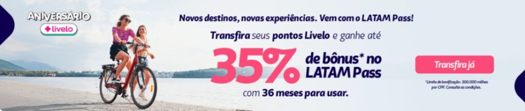 Com a campanha entre Livelo e LATAM Pass, será possível garantir pontos bônus, que poderão ser revertidos em viagens para destinos nacionais ou internacionais, além de diversas opções de produtos e serviços. Os assinantes do Clube LATAM Pass ou Clube Livelo que fizerem a transferência de pontos Livelo para o LATAM Pass ganham a bonificação de 35%, enquanto os demais participantes recebem 20% de bônus.