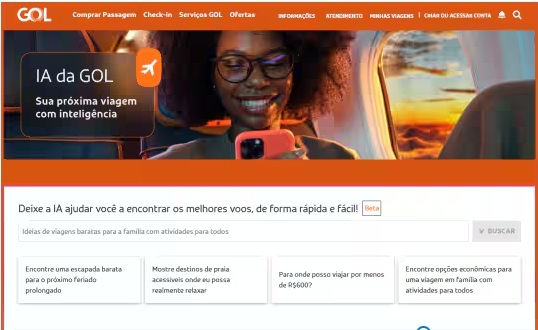 Pioneira em oferecer check-in digital, Wi-fi a bordo para entretenimento e um sistema que acompanha o voo em tempo real, a GOL implementa o uso de IA com uma solução inteligente para seguir encantando e fidelizando os clientes. Acesse o site neste link e confira.