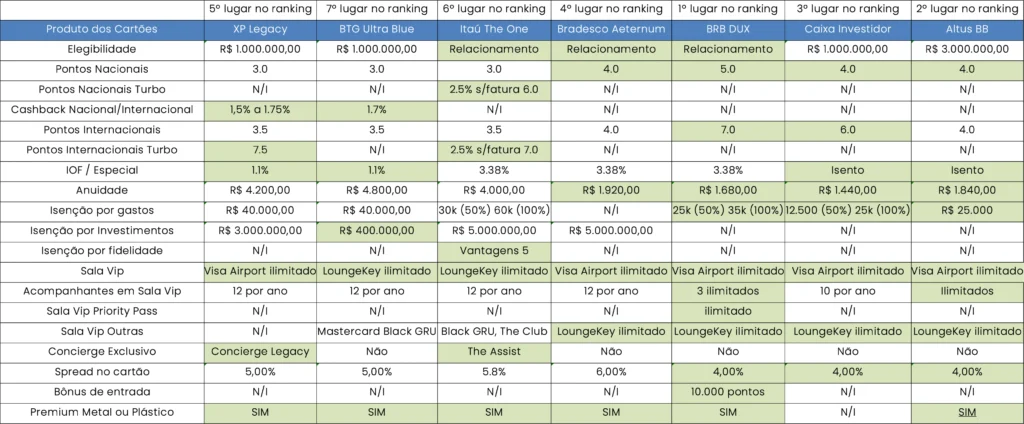 Este levantamento considera critérios objetivos divulgados pelas próprias instituições — pontuação, cashback, acesso a salas VIP, IOF, spread, concierge, isenção de anuidade, bônus de entrada e muito mais. O resultado você confere a seguir.