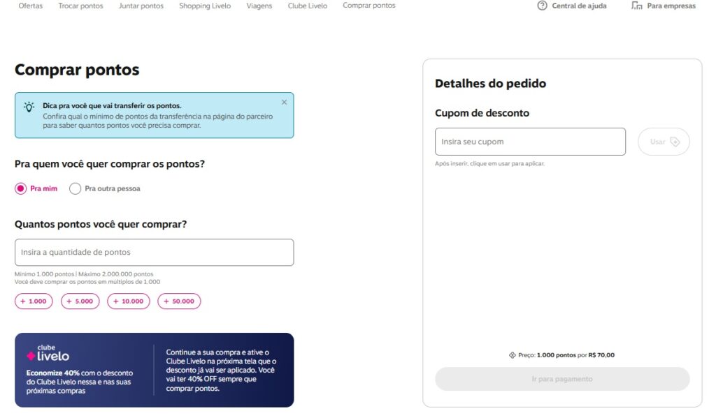 Para aproveitar a oferta, você precisa ser assinante do Clube Livelo e acessar a página de compra de pontos no site da Livelo. O desconto é aplicado diretamente no momento da compra.
