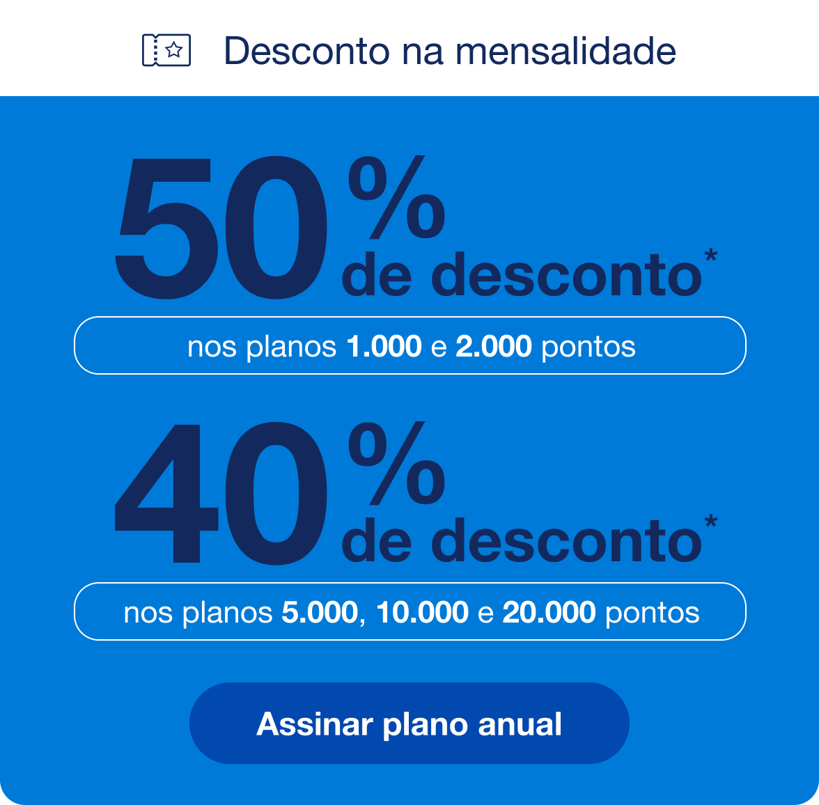 12. O participante que optar pela adesão ao Plano 5.000 Anual com 40% de desconto durante 12 meses receberá 5.000 pontos referente ao plano. O valor da mensalidade do Plano Anual 5.000 será de 12x R$ 104,40. Após a 12° mensalidade o valor do plano passará a ser cobrado integralmente.
