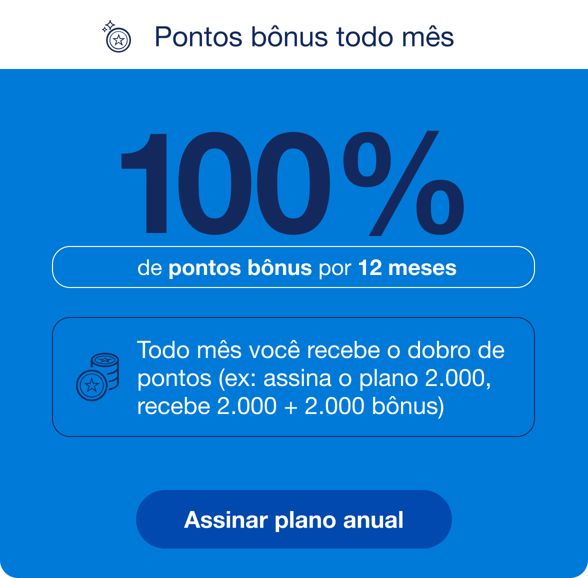 6. O participante que optar pela adesão ao Plano 2.000 Anual com 100% de bônus durante 12 meses receberá no 1° mês, 2000 pontos bônus, no 2º mês, 2000 pontos bônus, no 3º mês, 2000 pontos bônus, no 4º mês, 2000 pontos bônus, no 5º mês, 2000 pontos bônus, no 6º mês, 2000 pontos bônus no 7º mês, 2000 pontos bônus, no 8º mês, 2000 pontos bônus, no 9º mês, 2000 pontos bônus, no 10º mês, 2000 pontos bônus, no 11º mês, 2000 pontos bônus, no 12º mês, 2000 pontos bônus. Em todos os meses o cliente também receberá os 2.000 pontos referente ao plano. O valor da mensalidade do Plano Anual 2.000 será de 12x de R$ 74,00.