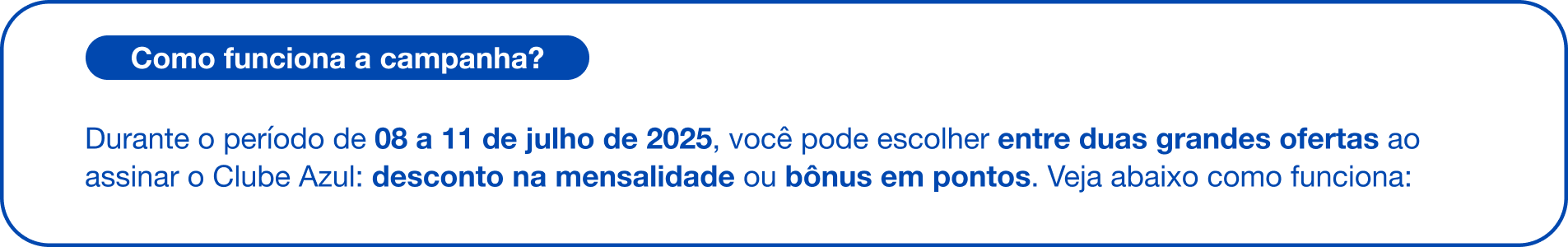 1.A Campanha é válida no período de 08/07/2025 às 09:00 até 11/07/2025 às 23:59, horário de Brasília, e serão considerados todos os participantes do “Programa de Fidelidade da Azul” que realizarem a adesão durante a Campanha de Aniversário do Passageiro de Primeira.