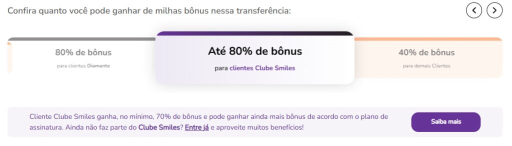 - Para ganhar o bônus máximo nesta promoção e o bônus por Plano do Clube Smiles, os clientes assinantes do Clube Smiles precisam estar com a assinatura ativa antes de realizar a transferência dos pontos para a Smiles no período da promoção;