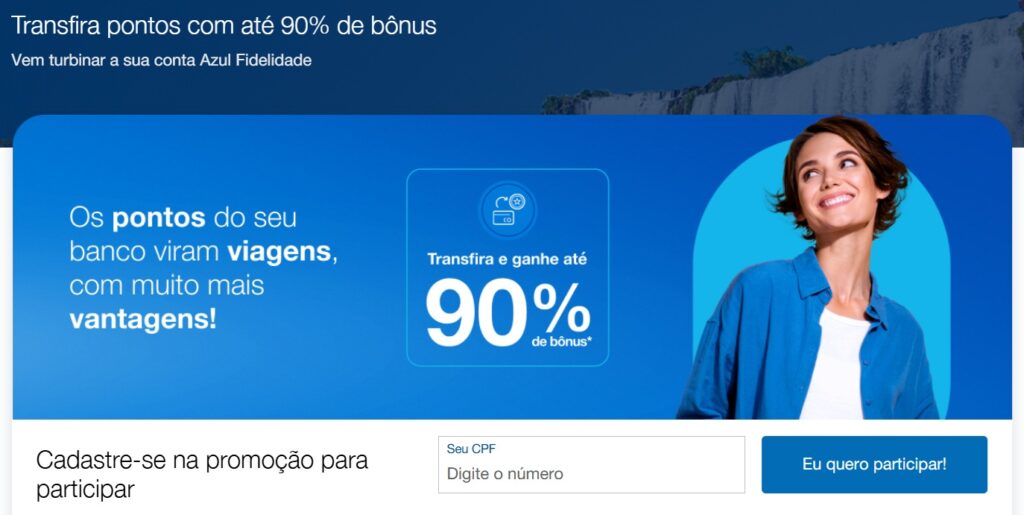 2. Para garantir o bônus, o cliente deve possuir cadastro no programa de fidelidade da Azul, com a conta em situação regular e cadastrar seu CPF no link da promoção https://www.voeazul.com.br/br/pt/ofertas/bancos