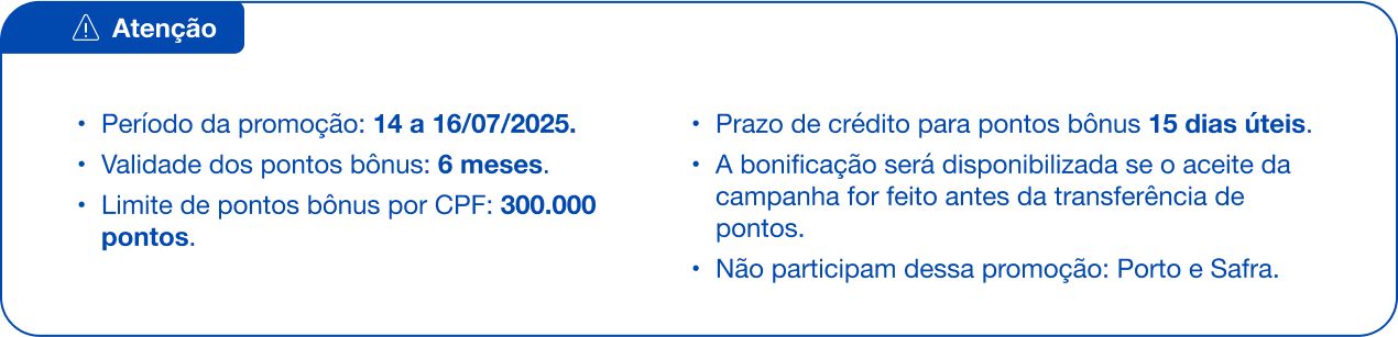 3.Clientes Azul: Bônus de 50% válido para clientes que transferirem pontos para o programa de fidelidade da Azul durante o período promocional. O limite máximo de pontos bônus a ser concedido por CPF é de 300.000 pontos. A bonificação será disponibilizada se o aceite da campanha for feito antes da transferência dos pontos.