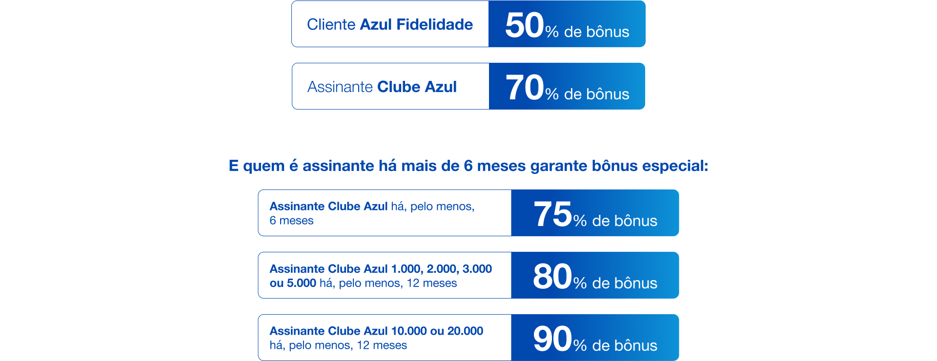 6.1. De acordo com a regras da Azul, assinantes Clube Azul 1.000, 2.000, 3.000 e 5.000 ativos há pelo menos 12 meses recebem mais 10% de bônus juntamente com os pontos transferidos, cumulativos com promoções. O limite de bônus cumulativo é de 20.000 pontos por ano.