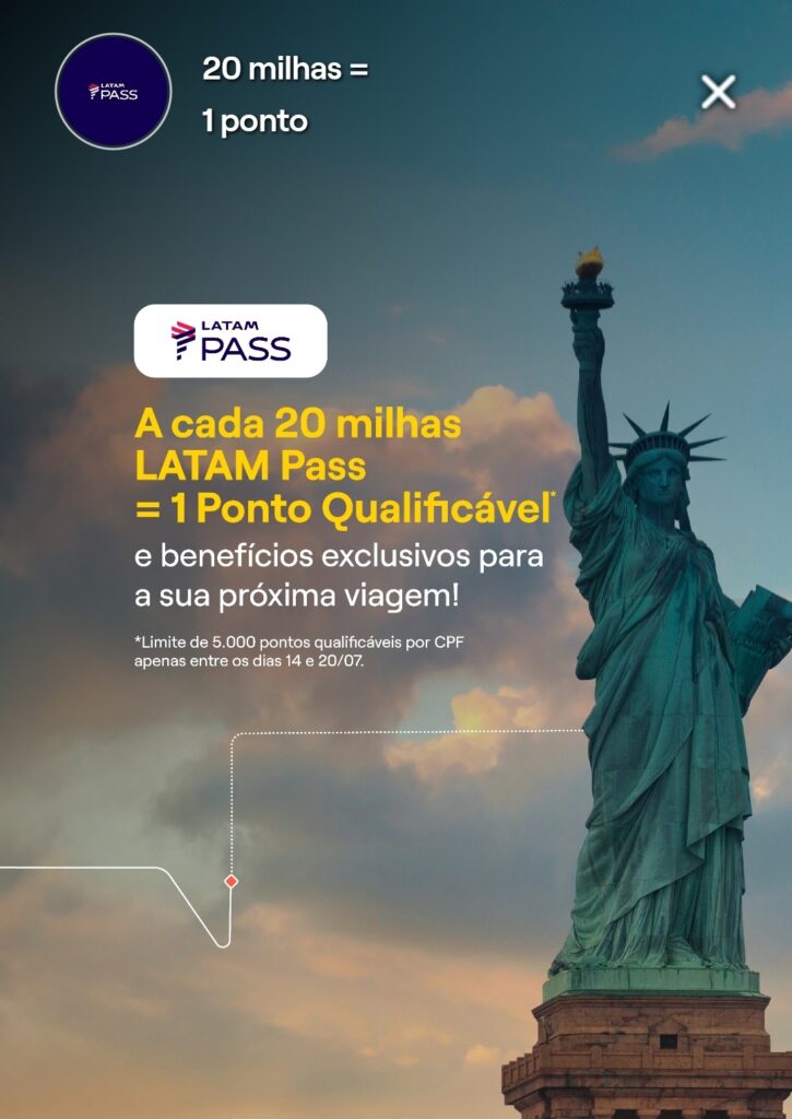 Troque pontos KMV por milhas LATAM Pass e ganhe 1 ponto qualificável a cada 20 milhas LATAM Pass. Válido para todos os clientes LATAM Pass. O limite máximo de pontos qualificáveis a ser concedido por CPF é de até 5.000 (cinco mil) pontos qualificáveis. Para mais detalhes, consulte o regulamento completo no site.Ler os termos e condições completos