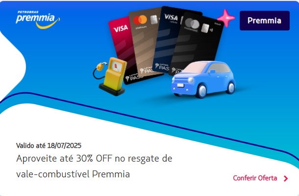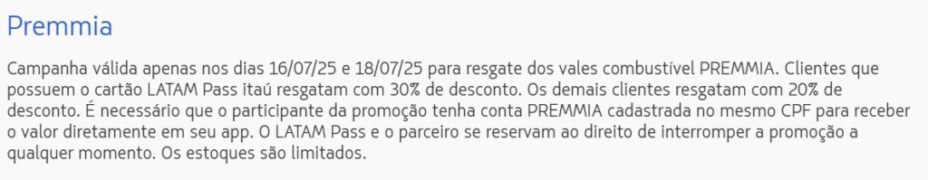 - Promoção Ativa (até 18/07/2025): Atualmente, o LATAM Pass está com uma oferta que oferece até 30% de desconto no resgate de vale-combustível Premmia.