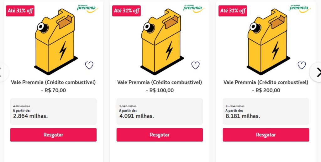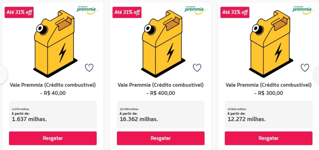 - Como funciona: Você usa suas milhas LATAM Pass para resgatar vales-combustível do Premmia, que podem ser utilizados para abastecer nos postos Petrobras ou comprar nas lojas BR Mania.