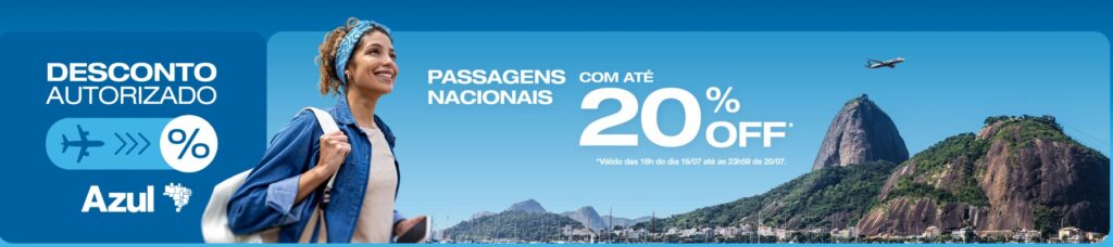É necessário ser cliente com o cadastro ativo no momento da compra e o titular da conta pagante da reserva deve também ser um dos passageiros. O desconto será fornecido em forma de Promocode e válido para 1 (uma) única compra por cliente Azul Fidelidade elegível, nos voos domésticos vendidos e operados pela Azul Linhas Aéreas, para embarques no período de 04/08/2025 a 30/11/2025, exceto de 19/11/2025 a 20/11/2025 e 23/11/2025 a 24/11/2025.