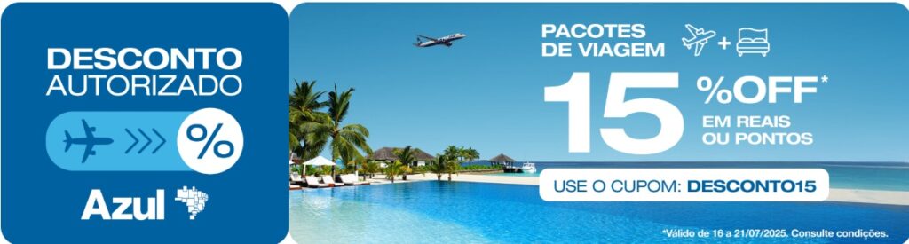 O código promocional “DESCONTO15”, que concede 15% de desconto, é válido para compras no período de 16/07/2025 a 21/07/2025 e viagens realizadas entre 16/07/2025 a 31/07/2026, exceto no período de 01/12/2025 a 31/01/2026. Disponível somente nos sites Azul Viagens (www.azulviagens.com.br), Azul Fidelidade (tudoazul.azulviagens.com.br), em nossa Central de Atendimento (4003-1118), Agências e Lojas Azul Viagens. O benefício aplica-se exclusivamente em pacotes (aéreo + hotel).