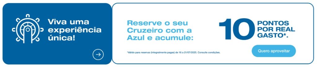 A campanha promocional que concede o acúmulo de 10 pontos Azul em reservas de Cruzeiros, é válida para reservas (integralmente pagas) de 16/07/2025 a 21/07/2025, e viagens realizadas entre 16/07/2025 à 31/12/2025. Disponível nos sites Azul Viagens (https://www.azulviagens.com.br), Azul Krooze (https://azul.krooze.com.br/), Voe Azul (https://www.voeazul.com.br/br/pt/home), em nossa Central de Atendimento (4003-1118), Agências e Lojas Azul Viagens. Clientes Azul Fidelidade serão pontuados com 10 pontos, a cada 1 real gasto. O código não é acumulativo com outras condições promocionais, aplicadas manualmente ou automaticamente na reserva, como por exemplo o acúmulo de 10% de desconto em pagamentos com o Cartão Azul Itaú.
