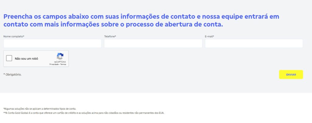 Preencha os campos abaixo com suas informações de contato e nossa equipe entrará em contato com mais informações sobre o processo de abertura de conta.