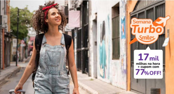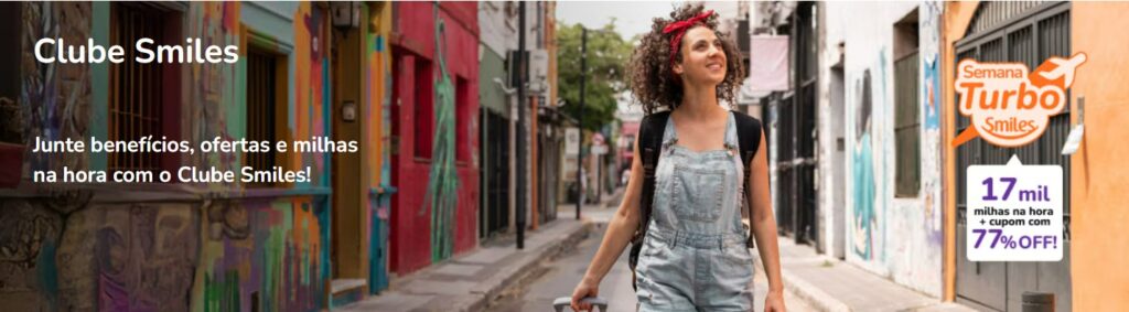 Clube Smiles é a sua porta de entrada para um novo mundo de viagens, onde você junta milhas todo mês e tem acesso a benefícios exclusivos. E na Semana Turbo Smiles, sua adesão vale muito mais: assinando o Plano 1.000, você ganha 17 mil milhas na hora e um cupom com 77% OFF para comprar até 50 mil milhas.