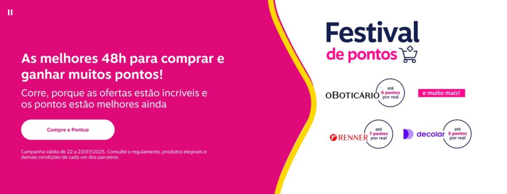 Barueri, 22 de julho de 2025 – Na 7ª edição do ano da campanha temática “Festival de Pontos”, a Livelo, maior empresa de recompensas do país, apresenta ofertas imperdíveis para quem deseja otimizar os gastos do dia a dia com parceiros dos segmentos de moda, casa, cosméticos e pets. É uma excelente oportunidade para aproveitar paridades altas e transformar compras online em muitos pontos, que depois podem ser trocados por viagens, produtos ou até mesmo dinheiro na conta.