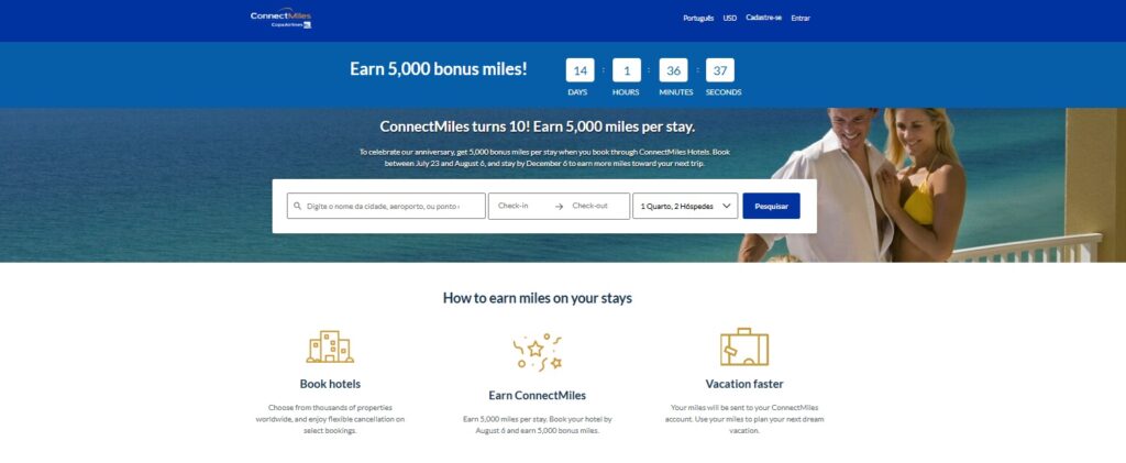 | Termos e Condições promocionais A Promoção: Como membro do ConnectMiles, ganhe 5.000 milhas bônus por estadia em suas reservas efetuadas por meio do ConnectMiles Hotels. Para participar dessa Promoção, a reserva do hotel deve ser efetuada por meio do site: https://connectmileshotels.copaair.com/ Vigência: Válido para reservas a partir de 0h (CT) do dia 23 de julho até as 23h59 (CT) do dia 6 de agosto de 2025. Válido para hospedagens até o dia 6 de dezembro de 2025.Para participar da Promoção, os membros devem seguir os passos abaixo:Entrar no site da Promoção: https://connectmileshotels.copaair.com/Reservar pelo menos duas (2) noites em qualquer um dos hotéis participantes do ConnectMiles Hotels.Promoção válida para reservas confirmadas com pagamento em dinheiro e/ou cartão de crédito.No momento do pagamento da reserva, o membro deve iniciar a sessão no ConnectMiles e informar o número da conta ConnectMiles no site especial da Promoção. O membro deve se hospedar no hotel para o qual a reserva foi feita.Máximo de trés (3) reservas por usuário durante a promoção.A Promoção será considerada válida desde que o membro tenha completado o período total da reserva, ou seja, ao fazer o check-out no hotel.Esta Promoção não está vinculada a promoções de outras plataformas de reservas de hotéis nem a ofertas do Booking.com.A Promoção não pode ser combinada ou aplicada a reservas pré-existentes, nem se aplica retroativamente a reservas que não foram feitas por meio do link promocional. O ConnectMiles Hotels reserva-se o direito de anular o bônus a qualquer momento, caso sejam detectados erros técnicos, caso ocorra cancelamento ou remarcação das reservas usando os mesmos critérios de busca e/ou por qualquer comportamento que vise burlar os presentes Termos e Condições, incluindo contas múltiplas. O bônus será depositado na conta ConnectMiles informada pelo membro no momento do pagamento da reserva. As milhas ConnectMiles serão creditadas na conta do usuário no prazo de uma (1) a cinco (5) semanas após o término da hospedagem no hotel, desde que o usuário cumpra as condições estabelecidas. Em caso de cancelamento da reserva, as milhas ConnectMiles não serão creditadas na conta do membro. Caso necessite de assistência com suas reservas ou tenha dúvidas relacionadas aos requisitos de participação na Promoção, ou caso as milhas não sejam creditadas na conta ConnectMiles decorridas cinco (5) semanas da hospedagem, entre no site https://connectmileshotels.copaair.com/terms para obter mais informações sobre as condições ou entre em contato com a equipe do ConnectMiles Hotels por e-mail (connectmileshotels@rocketmiles.com) ou por telefone, no Panamá: + 507 8338897; Colômbia (local): 57 601 5085974; Brasil: 551142807208; EUA: 7732312753. Entre em contato diretamente com o ConnectMiles por meio do formulário disponível aqui, caso tenha dúvidas sobre voos e o programa ConnectMiles ou queira saber como resgatar milhas ConnectMiles. A Promoção não pode ser combinada com outras promoções e/ou descontos.Os Termos e Condições desta Promoção estão sujeitos a alterações. Outras restrições podem ser aplicáveis. As milhas obtidas por meio da Promoção são independentes do sistema de acúmulo de milhas do cartão de crédito do membro.As milhas acumuláveis são milhas-prêmio. Não são aplicáveis para obter promoção a outro status. Visite o site https://connectmileshotels.copaair.com/termspara rever integralmente os Termos e Condições do ConnectMiles Hotels. Aplicam-se todos os Termos e Condições do ConnectMiles. Para mais informações, acesse o link: https://www.copaair.com/es/web/gs/terminos-condiciones. |