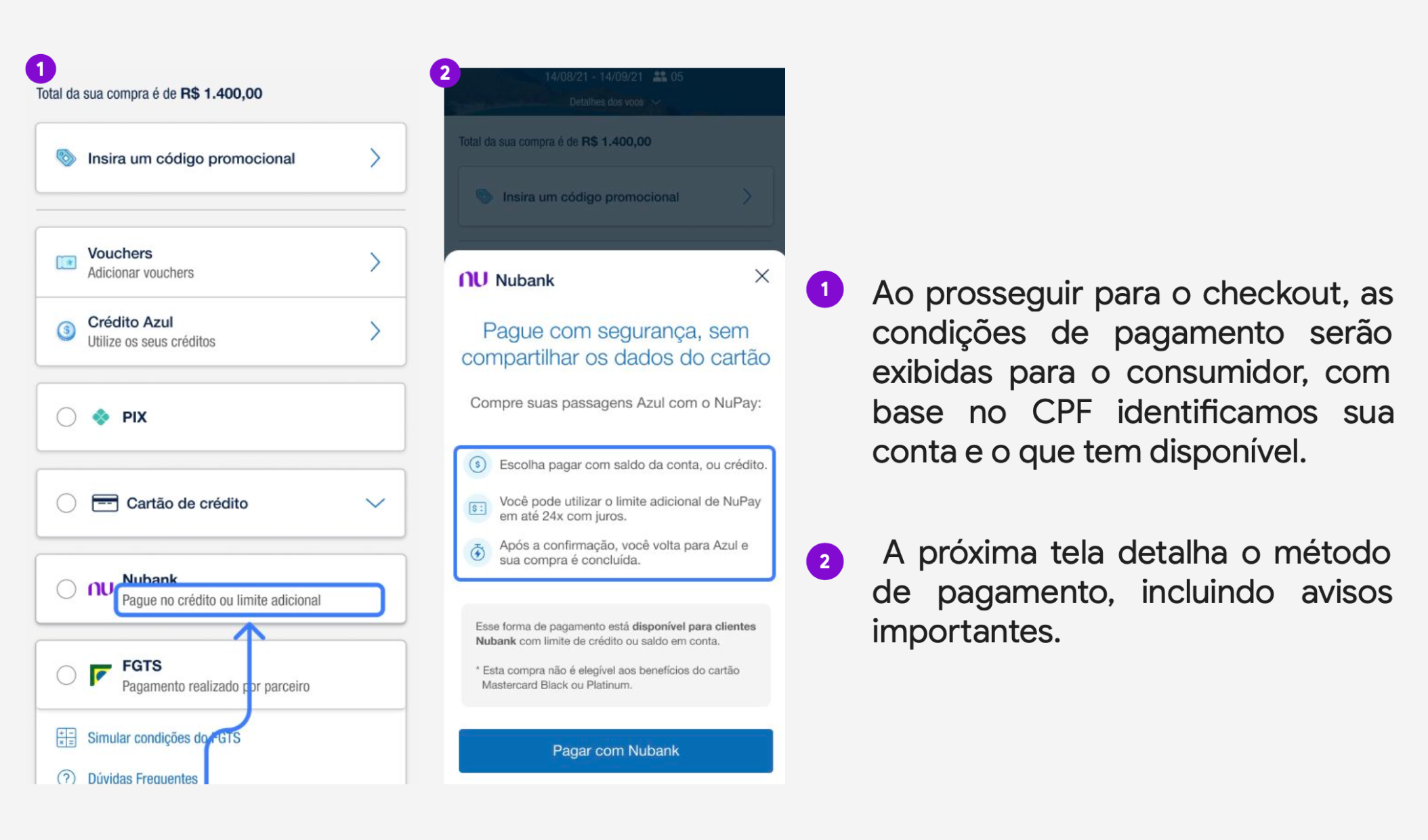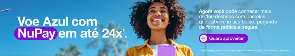 Essa modalidade de pagamento estará disponível apenas para compras feitas no app da Azul. Neste momento, compras feitas via site, callcenter, aeroportos e agências não poderão ser pagas via NuPay.