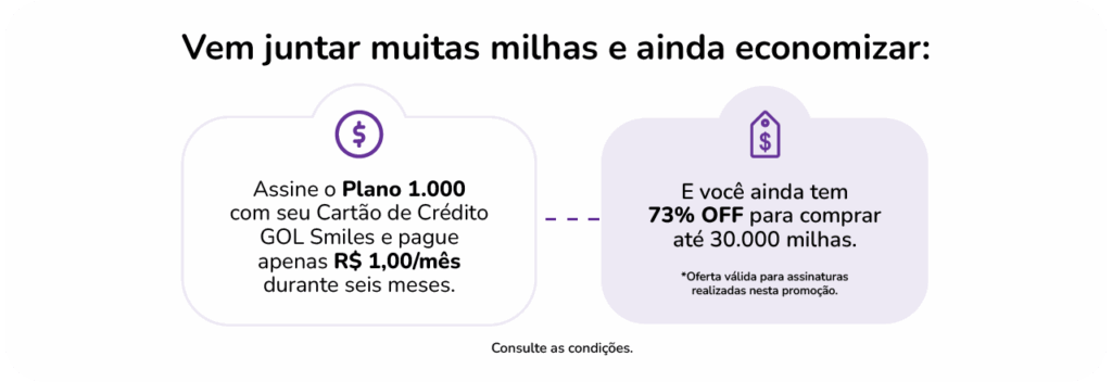 A viagem dos sonhos começa aqui! Com o Clube Smiles e o Cartão de Crédito GOL Smiles, os benefícios só aumentam. Assine o Plano 1.000 por apenas R$1,00/mês nos seis primeiros meses e ainda ganhe um cupom de 73% OFF para comprar até 30.000 milhas!