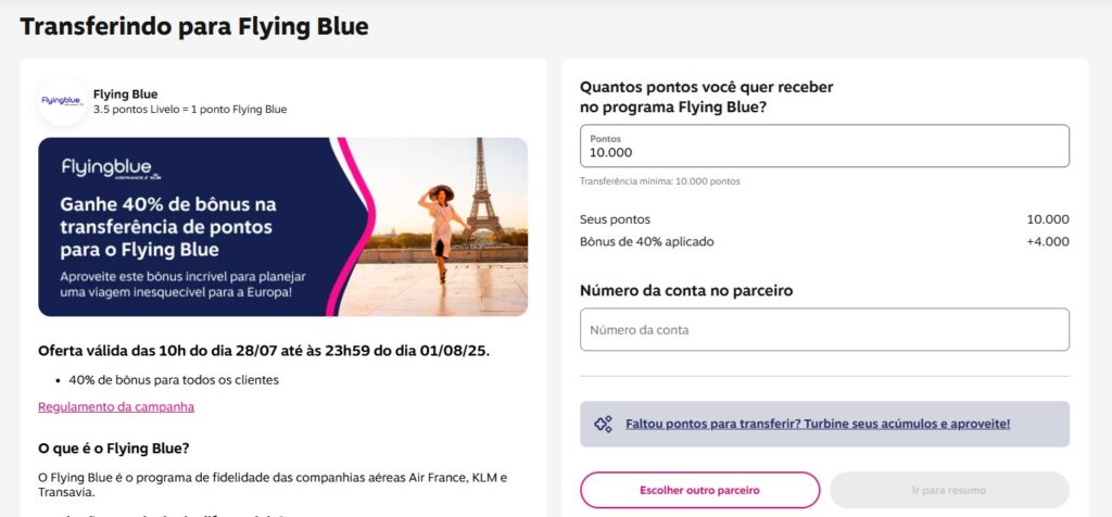 Para aproveitar essa oferta, é necessário ter cadastro no site do programa e transferir, no mínimo, 10 mil pontos Livelo. Além disso, a paridade é de 3.5 pontos Livelo por 1 milha flying blue, ou seja, ao transferir 3.500 pontos Livelo, por exemplo, o participante obterá 1.000 milhas. A pontuação será creditada em até 2 dias úteis após a transferência e terão validade de 24 meses. Todas as informações, assim como o regulamento, estão disponíveis aqui.