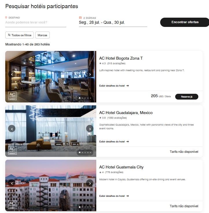 • Ganhe 3,000 pontos por estadia nos hotéis Marriott, Sheraton, Delta Hotels, Westin, Le MERIDIEN, Renaissance Hotels, Autograph Collection Hotels e Tribute Portfolio