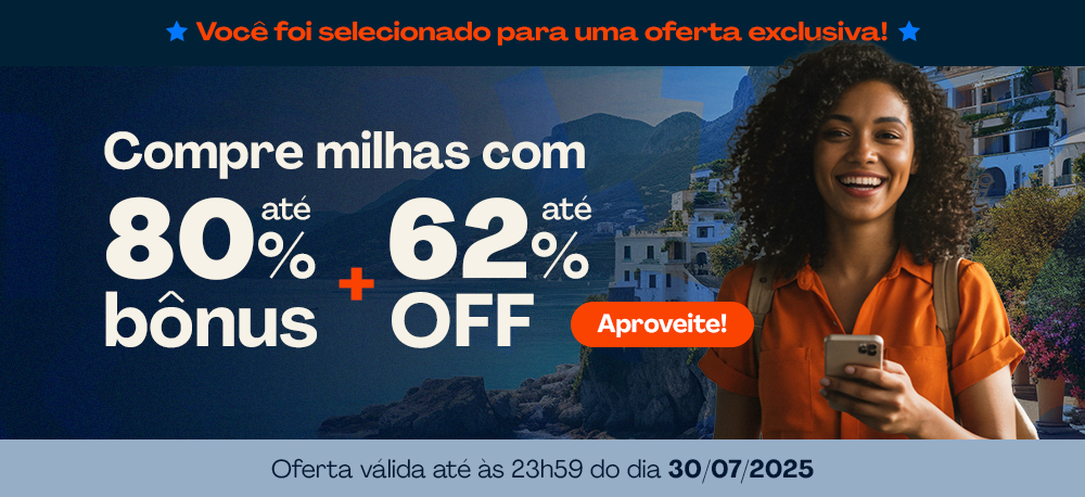 Compre milhas com até 80% de bônus + até 62% OFF e já comece a preparar as malas e o roteiro da próxima viagem.