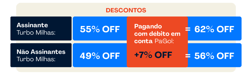 - Para garantir o maior desconto na oferta o cliente precisa ser Assinante Turbo Milhas antes de realizar a compra e efetuar o pagamento com débito em conta PaGol.