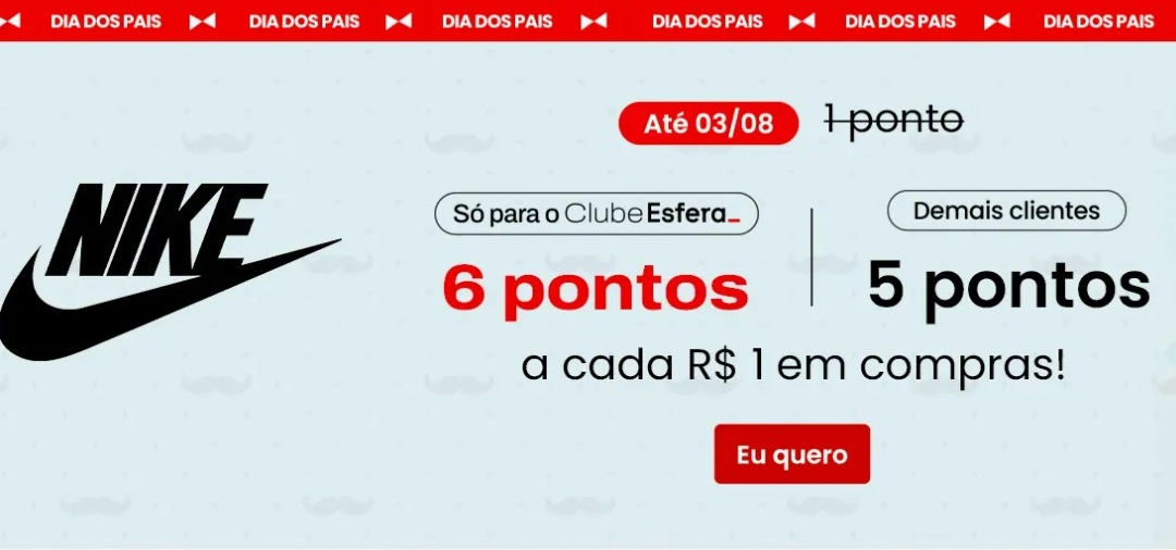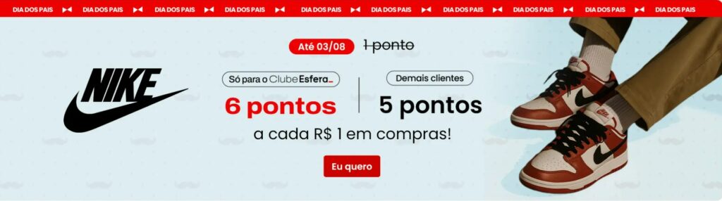 * 6 pontos a cada R$ 1,00 em compras no site parceiro para clientes Clube Esfera e 5 pontos a cada R$ 1,00 para os demais clientes.