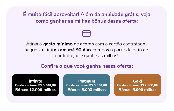 • As milhas bônus serão concedidas aos clientes que solicitarem o cartão durante a oferta, atingirem o gasto mínimo da variante contratada em uma ou mais faturas, desde que o valor gasto seja pago integralmente em até 90 dias corridos.