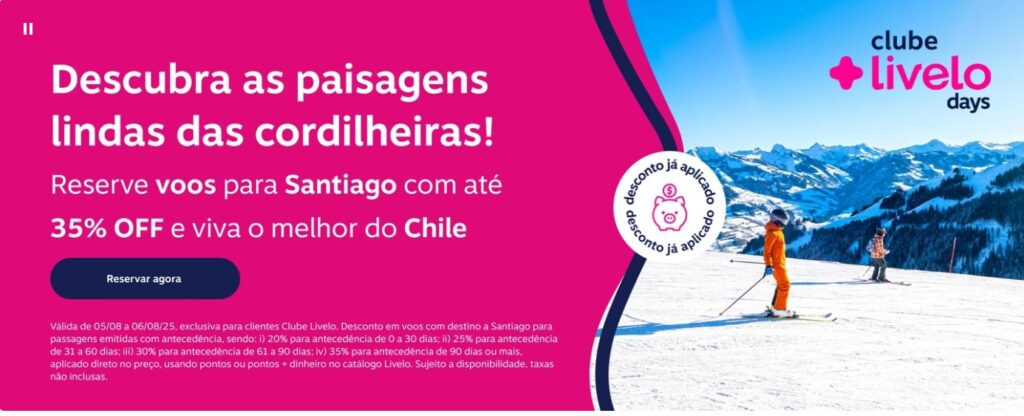 Viajar para Santiago ficou ainda mais vantajoso com as ofertas exclusivas para quem faz parte do Clube Livelo. Os assinantes contam com até 35% de desconto ao trocar pontos em passagens para a capital chilena, com a porcentagem variando conforme a antecedência da emissão: