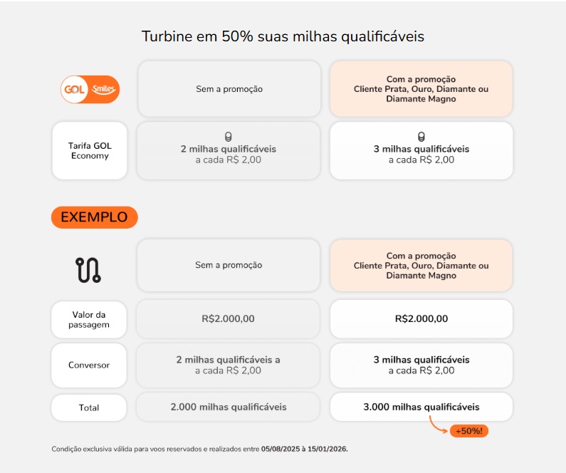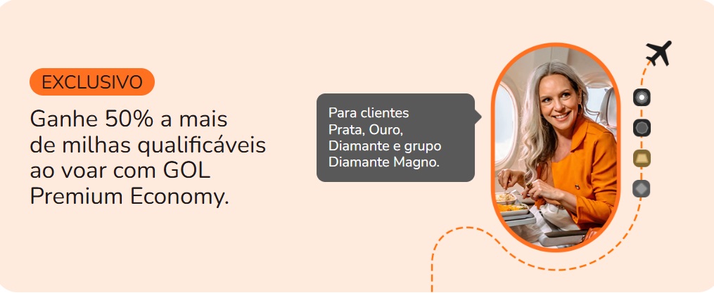 Chegou a promoção perfeita para quem ama realizar voos internacionais. Agora, clientes das categorias Prata, Ouro, Diamante e do grupo Diamante Magno juntam 3 milhas qualificáveis a cada R$ 2,00 gastos em passagens GOL na Premium Economy.