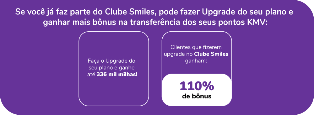 Para ganhar o bônus de 110%, o cliente precisa, primeiro, aderir ao Clube Smiles ou fazer um Upgrade de plano no Clube Smiles e, depois, trocar pontos KMV.