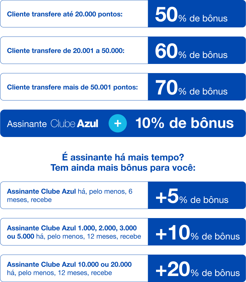 3.2. Clientes Azul que transferirem entre 20.001 pontos e 50.000 pontos durante a promoção receberão bônus de 60%. Clientes assinantes Clube Azul, receberão bônus de 70%. O limite de pontos bônus por CPF é de 300.000 pontos.