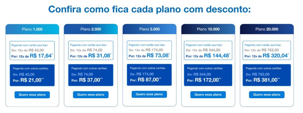 12. Para ser elegível ao desconto exclusivo de 16% na mensalidade dos planos, os clientes portadores do Cartão Azul Itaú devem cadastrar o cartão como forma de pagamento. Benefício elegível aos portadores dos cartões nas categorias Internacional, Gold, Platinum, Infinite e Skyline.