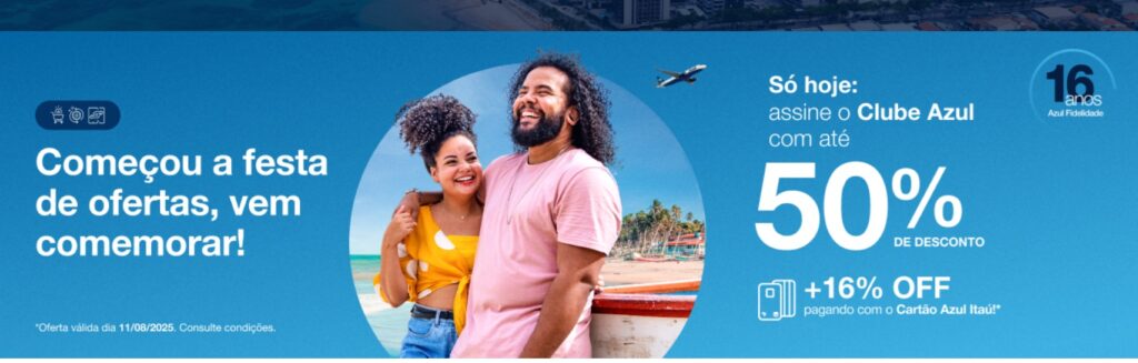 1. A Campanha é válida no período de 11/08/2025 às 14:00 até 11/08/2025 às 18:00, horário de Brasília e serão considerados todos os participantes do “Programa de Fidelidade da Azul” que realizarem a adesão ao Clube Azul no período da promoção através do site promocional da campanha.