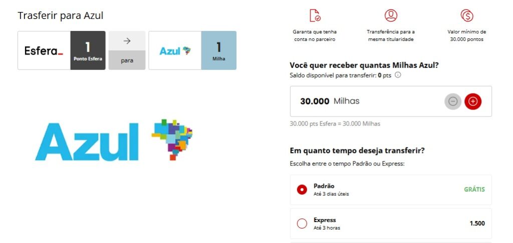 Quantidade mínima para a troca de pontos: 30.000 Pontos Esfera;