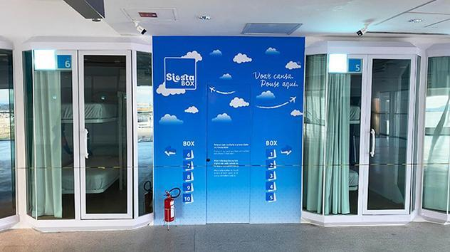 Lado ar – 2º andar. O Siesta Box está localizado no meio do conector entre a praça de alimentação e os portões de voos domésticos.