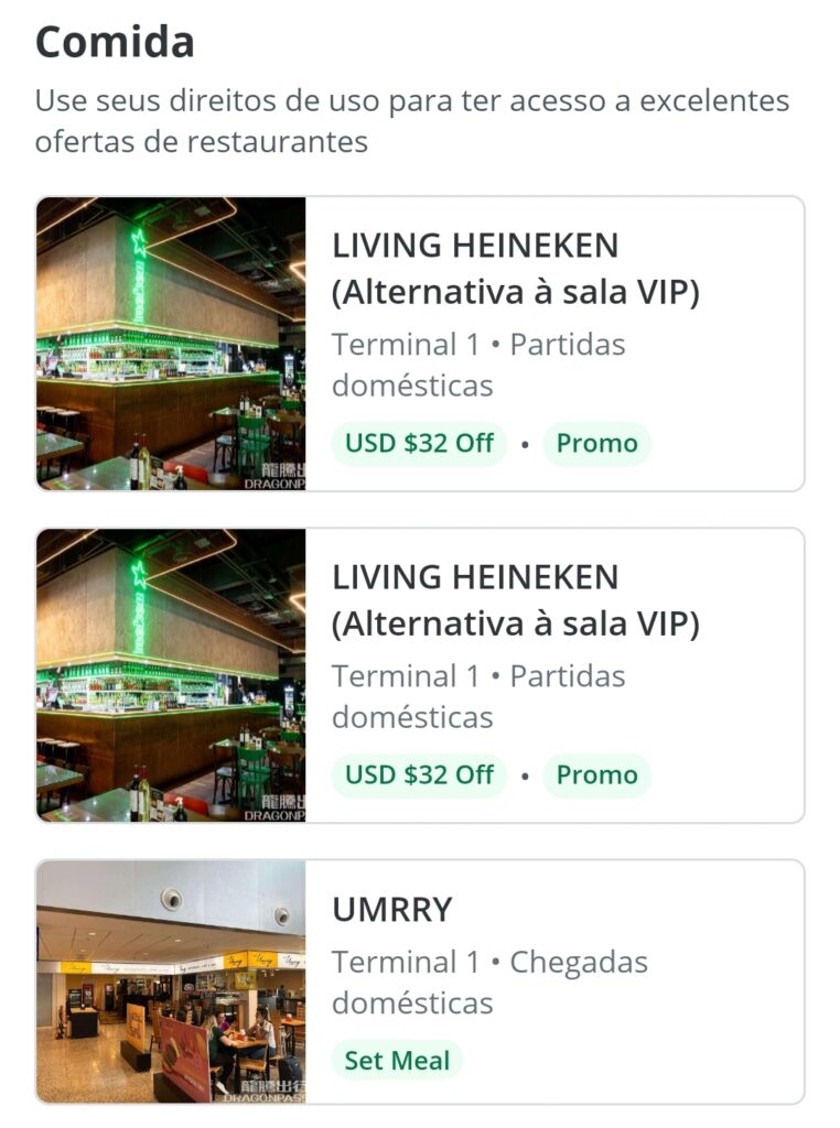 6. Este local é oferecido como alternativa à visita à sala VIP e outras experiências no aeroporto. O uso repetido dos direitos em uma única viagem ao aeroporto pode resultar em cobranças do seu provedor de benefícios.