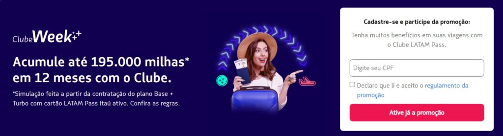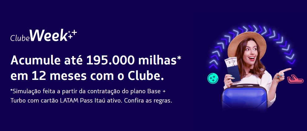 O Clube Week é a melhor oportunidade do ano para você acumular as milhas da sua viagem. Assine o Clube LATAM Pass e acumule até 195.000 milhas em 1 ano!