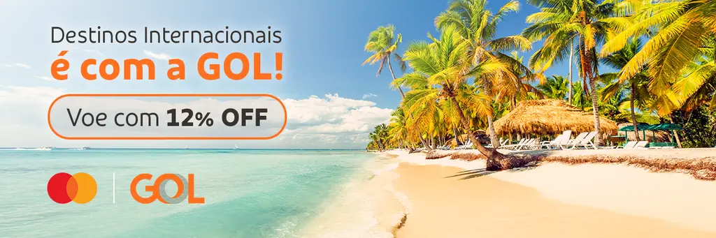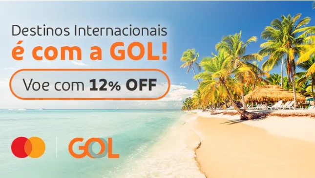 Destinos Internacionais é com a GOL! Ganhe 12% de desconto em voos internacionais operados pela GOL Linhas Aéreas (G3). Válido nos canais de venda: Website e APP GOL. Período de venda: 24/07/2025 até 31/08/2025. Período de voo: de 01/08/2025 até 31/11/2025. Oferta limitada a 1 resgate de cupom por CPF. Desconto válido somente para voos internacionais operados pela GOL Linhas Aéreas (G3). Consulte os termos e condições da oferta.
