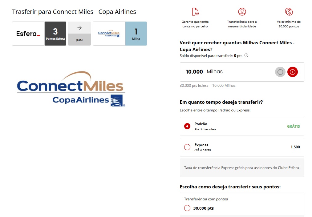 · Trocas válidas apenas entre contas Esfera e ConnectMiles de mesma titularidade.