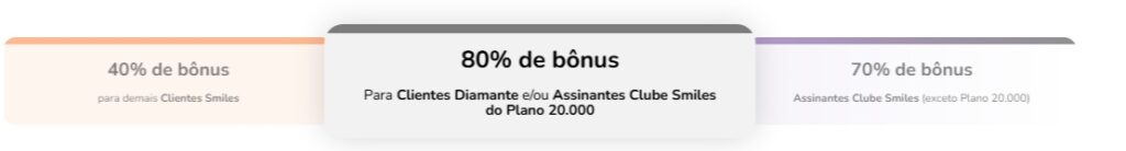 - Cliente Diamante e/ou assinante Clube Smiles 20.000: 80%; assinantes Clube, demais planos: 70%; Clientes Ouro e Prata: 60%; demais clientes Smiles: 40%;