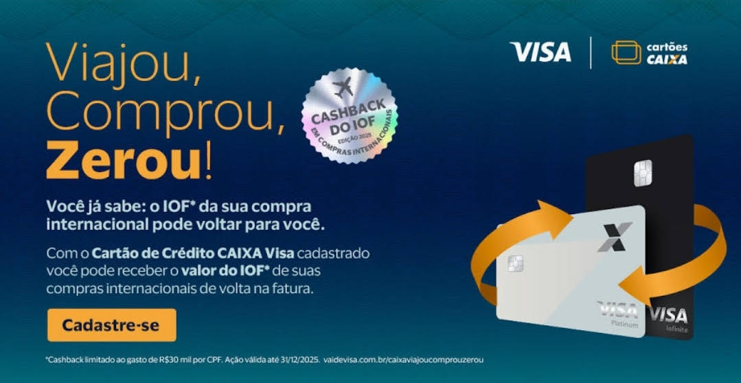 Use seu Cartão de Crédito CAIXA Visa Infinite ou CAIXA Visa Platinum e receba cashback equivalente ao valor do IOF nas compras internacionais, sejam elas presenciais ou on-line. Viaje, compre e aproveite!