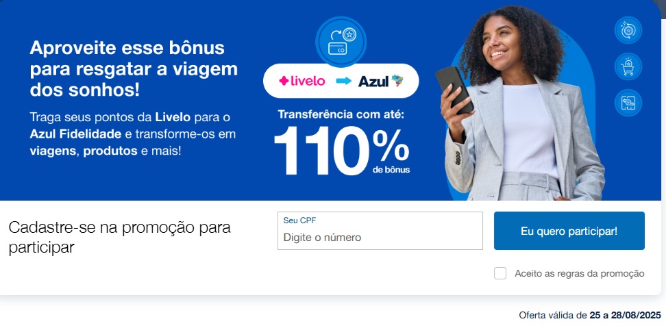 • 70% de bônus para não assinantes dos Clubes Livelo e/ou Azul;