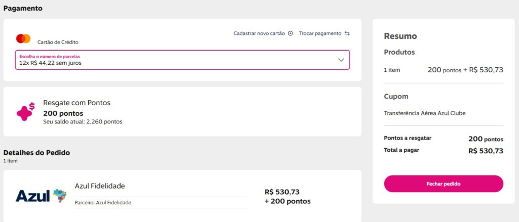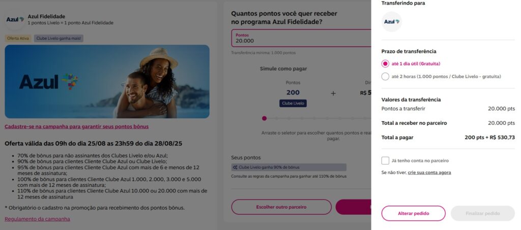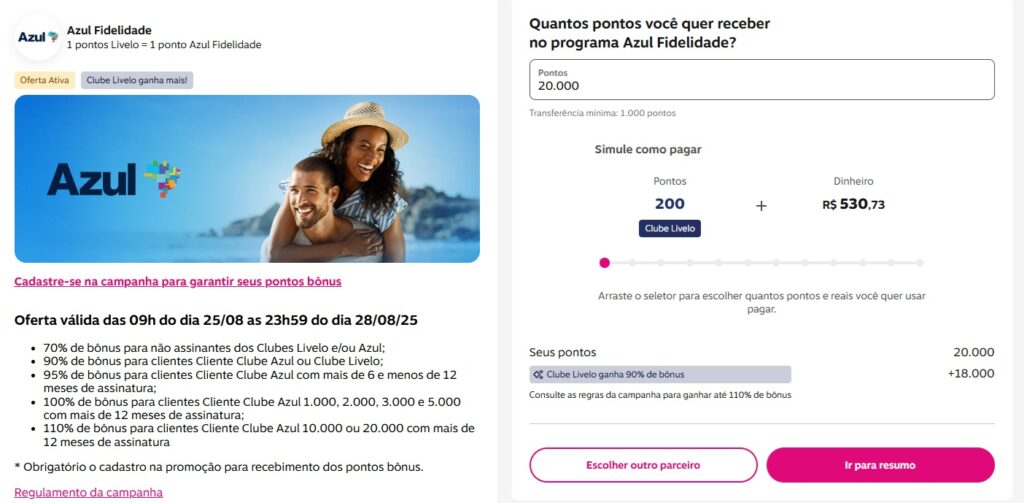 • 90% de bônus para clientes Cliente Clube Azul ou Clube Livelo;
