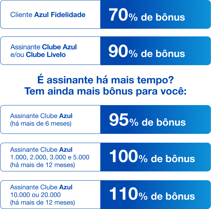 • 110% de bônus para clientes Cliente Clube Azul 10.000 ou 20.000 com mais de 12 meses de assinatura