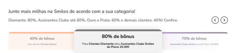 - O bônus da promoção é de acordo com a categoria do cliente na Smiles e/ou assinatura do Clube Smiles;