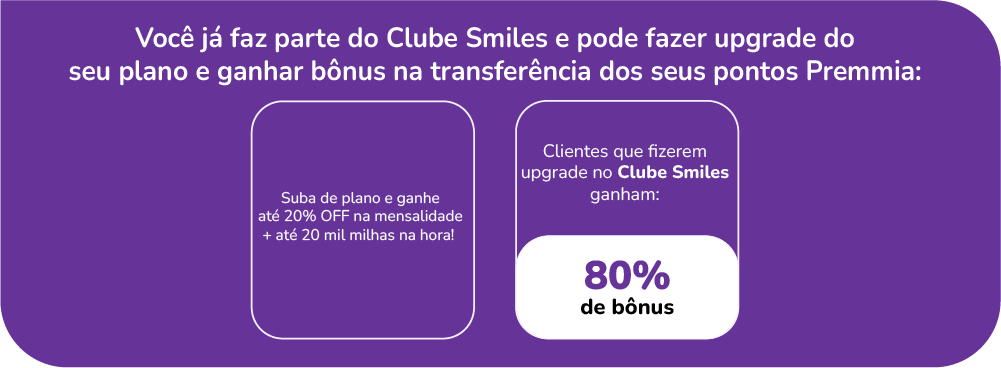 • Para ganhar o bônus de 80%, o cliente precisa, primeiro, aderir ao Clube Smiles ou fazer um Upgrade de plano no Clube Smiles e, depois, trocar pontos Premmia.